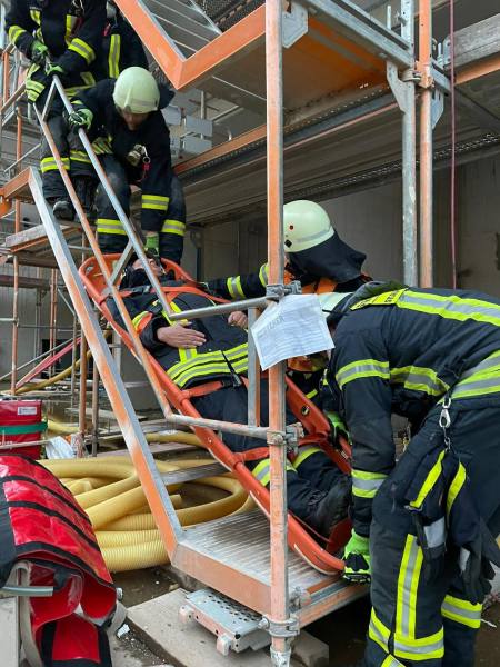 Während Trupps die beiden verletzten Personen versorgten, wurde die Brandbekämpfung eingeleitet und die Befreiung und Rettung der Verletzten vorbereitet. Hebekissen kamen zum Einsatz, um die Betonplatte anzuheben. Die Person im 2. Stock wurde mittel Schleifkorbtrage nach unten getragen. Die vermisste Person konnte glücklicherweise schnell gefunden und an den Rettungsdienst übergeben werden.