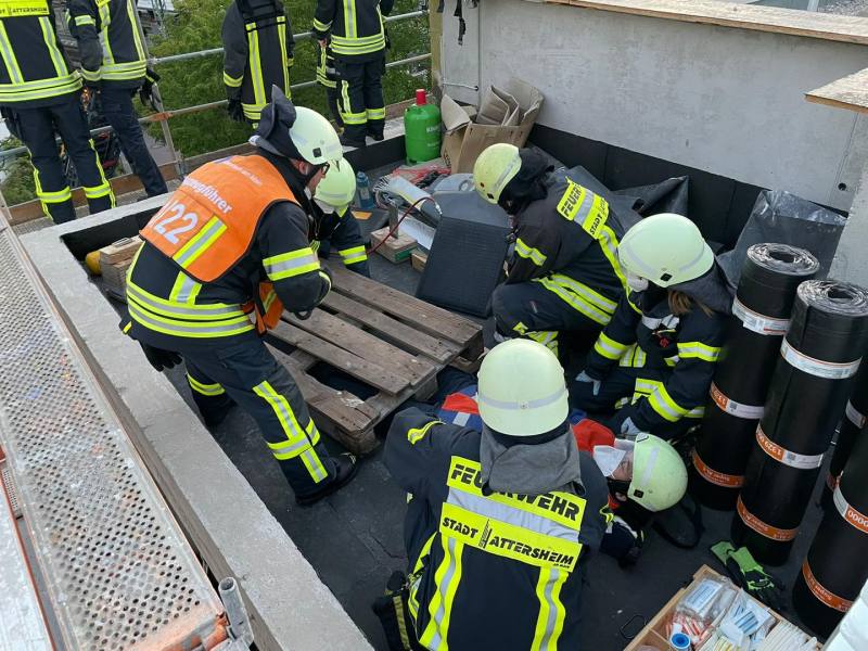 Löschgruppenfahrzeug, Drehleiter, Rüstwagen und Tanklöschfahrzeug rückten gegen 20:00 Uhr in der Untertorstraße direkt neben dem Bahnhof Hattersheim an. Die vier Einheitsführer erkundeten die Lage und stimmten sich ab. Auf dem Dach des Rohbaus galt es ein Feuer zu bekämpfen – zwei Bauarbeiter hatten schon mit Löschmaßnahmen begonnen. Auf der anderen Seite des Daches war eine Person unter einer Betonplatte eingeklemmt. Eine verletzte Person musste vom 2. Stock des Baugerüstes gerettet werden und eine weitere Person war auf der Baustelle vermisst.