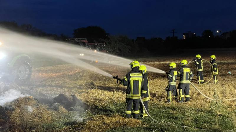 Um den Brand zu bekämpfen, setzten wir insgesamt sechs Rohre ein, wobei einige Feuerwehrleute unter Atemschutz agierten. Die Wasserversorgung konnten wir über eine Zisterne und durch einen Pendelverkehr zu einem nahegelegenen Hydranten sicherstellen. Dank der Unterstützung des Hofbesitzers und benachbarter Landwirte konnte das angrenzende Feld umgepflügt werden, um eine Ausbreitung des Feuers zu verhindern. Zudem wurde das Heu auseinandergezogen, um die Brandbekämpfung zu erleichtern.