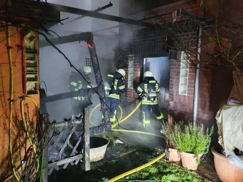 Durch einen massiven Löschangriff konnte das Wohngebäude noch rechtzeitig geschützt werden. Die Besatzung der Drehleiter löschte die Tanne ab und unterstütze bei den Löschmaßnahmen an der Doppelgarage. Weitere Kräfte kontrollierten einen angrenzenden Anbau sowie die Doppelgarage von der Rückseite. Durch das Feuer brannte der PKW vollständig aus. Inventar, welches in der Garage gelagert war, verbrannte teilweise vollständig. Die Statik der Garagen wurde durch die enorme Hitzeeinwirkung beeinträchtigt und muss überprüft werden. Am Wohngebäude wurde die Außenfassade, einige Fenster sowie die Eingangstür beschädigt.