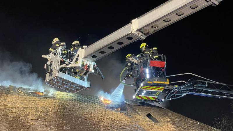 Feuerwehr und Rettungsdienst waren bis gegen 04:00 Uhr mit einem Großaufgebot im Einsatz. Zahlreiche Atemschutztrupps bekämpften den Brand im Dachgeschoss. Das Dach musste über die Drehleiter, einen Teleskopmast, einen Kran und einen Bagger umfangreich geöffnet werden, um die Brandnester löschen zu können.