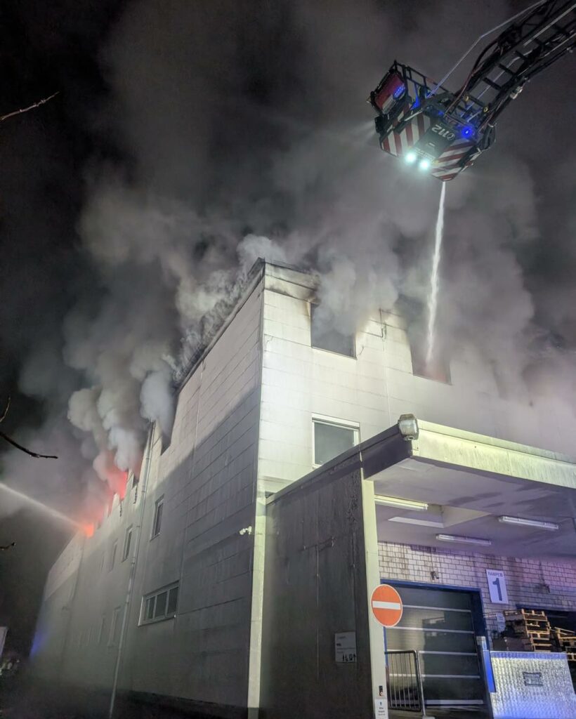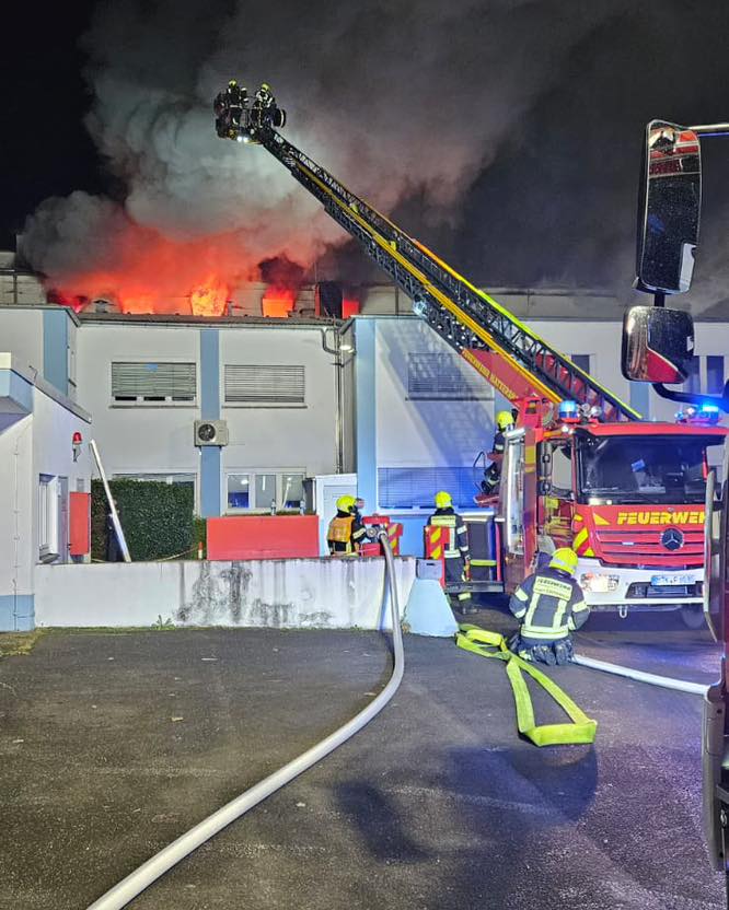 Um ca. halb 2 Uhr kam es zu einem Großbrand in einem Hattersheimer Gewerbeobjekt in der Schulstraße. Dort waren Akkus und Solarpanele in einem Gebäude gelagert. Das Feuer breitete sich schnell aus, sodass das gesamt Dachgeschoß in Vollbrand stand und im Laufe des Brandgeschehens auch durchzündete.