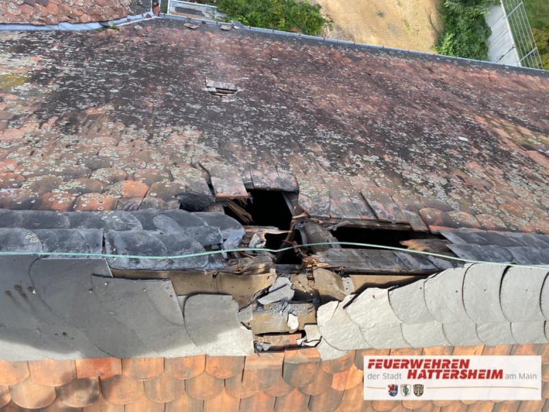 Die Feuerwehr öffnete die Eingangstür und konnte glücklicherweise schnell Entwarnung geben. Mit der Drehleiter wurde das Gebäudedach kontrolliert und ein größeres Loch durch zwei ausgebildete Höhenretter der Feuerwehr Hattersheim mit Planen abgedeckt.