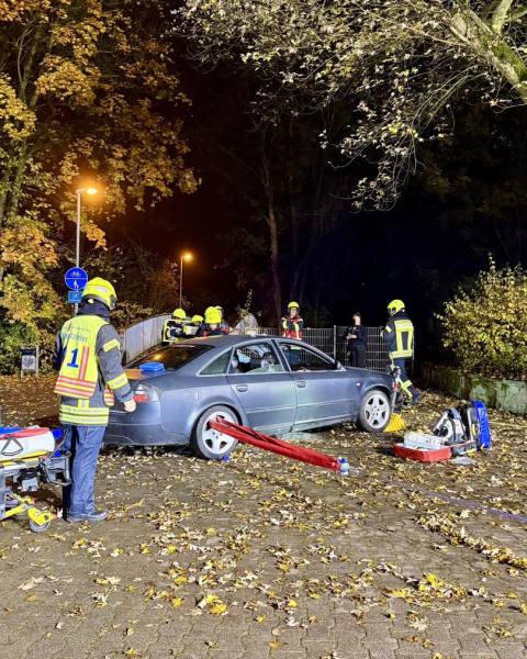 Gegenüber des Schwimmbads steckte ein Pkw zwischen zwei Pollern fest. Der Fahrer war mit beiden Beinen in der Fahrertür eingeklemmt.