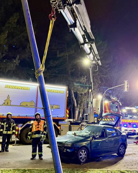 Wir wurden mit der Meldung „Unfall mit eingeklemmter Person – Pkw vs. Laterne“ zur Kreuzung Südring/Frankfurter Straße in Hattersheim alarmiert. Ein Pkw war bei einem Alleinunfall zunächst gegen ein Straßenschild gefahren, kippte dann auf die Seite und prallte gegen einen Laternenmast.